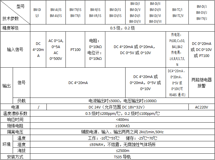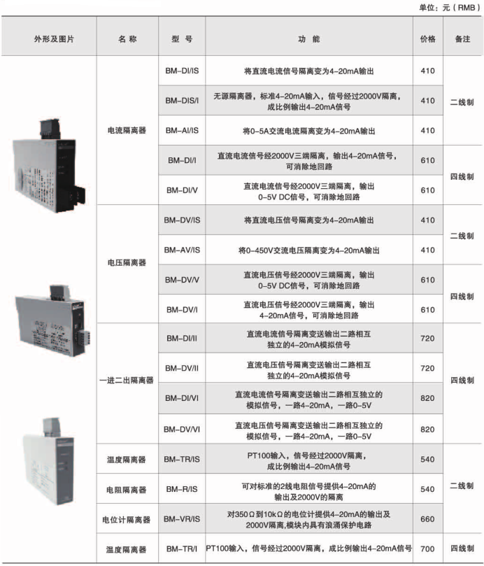 | 溫度隔離器 | BM-TR/IS | PT100輸入,信號經(jīng)過2000V隔離,成比例輸出4-20mA信號 | 二線制 |