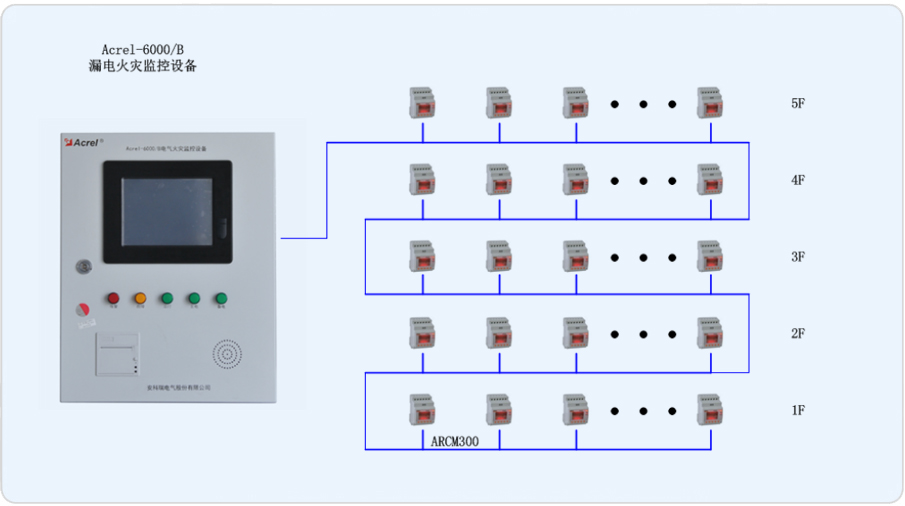 系統(tǒng)組網(wǎng)共分為站控管理層、網(wǎng)絡(luò)通訊層、現(xiàn)場(chǎng)設(shè)備層三層,該項(xiàng)目通訊總線共接入一條通訊總線,總線在樓層配電箱手拉手串接后,接入壁掛式后臺(tái),組成電氣火災(zāi)系統(tǒng)的大動(dòng)脈。箱體中漏電流互感器通過電流線接入漏電探測(cè)器,漏電探測(cè)器實(shí)時(shí)顯示漏電情況,組成一套信號(hào)穩(wěn)定,精度可靠的電氣火災(zāi)監(jiān)測(cè)系統(tǒng)。