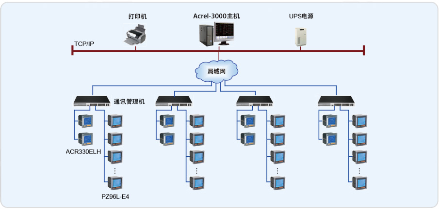 該系統(tǒng)總計有79只儀表(其中包括8只ACR330ELH諧波儀表,71只PZ系列智能儀表),分8條總線,由于四個變電所之間距離較遠(yuǎn),并且較為分散,采用每個變電所內(nèi)自行組網(wǎng),然后并入惠氏公司內(nèi)部局域網(wǎng)的方式,實該現(xiàn)場總線上儀表與監(jiān)控主機的數(shù)據(jù)連通。