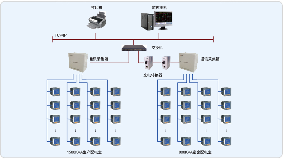 山東電力管道工程公司有兩個配電室:容量1500KVA的生產(chǎn)配電室和800KVA的宿舍配電室,兩個配電室距離約1500米,為實現(xiàn)配電系統(tǒng)的規(guī)范化管 理,對舊的配電系統(tǒng)進行改造,兩配電室內(nèi)的老式指針式儀表更換為上海安科瑞公司的網(wǎng)絡(luò)電力儀表,配套Acrel-2000電力監(jiān)控軟件對現(xiàn)場進行監(jiān)控,監(jiān)控室位于生產(chǎn)配電室內(nèi)。為滿足兩個配電室統(tǒng)一監(jiān)控的要求,容量1500KVA的生產(chǎn)配電室和800KVA的宿舍配電室通過一根單模四芯的光纖相連,經(jīng)光電轉(zhuǎn)換后接入網(wǎng)絡(luò)交換機,進而實現(xiàn)對現(xiàn)場數(shù)據(jù)的采集,存儲,處理,實時顯示以及歷史查詢。
