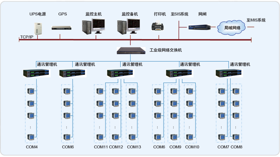 為了能實現(xiàn)對電廠電能量數(shù)據(jù)進行自動采集、遠傳和存儲、預處理、線損統(tǒng)計及分析的電能綜合管理平臺,合肥電廠電能量管理系統(tǒng)采用了Acrel-3000電能管理軟件,通過現(xiàn)場總線把現(xiàn)場的電能儀表進行集中管理,做到了自動采集、集中控制、智能管理。同時本電能管理系統(tǒng)還具備同廠內(nèi)SIS(監(jiān)控信息系統(tǒng))以及MIS(管理信息系統(tǒng))共享。