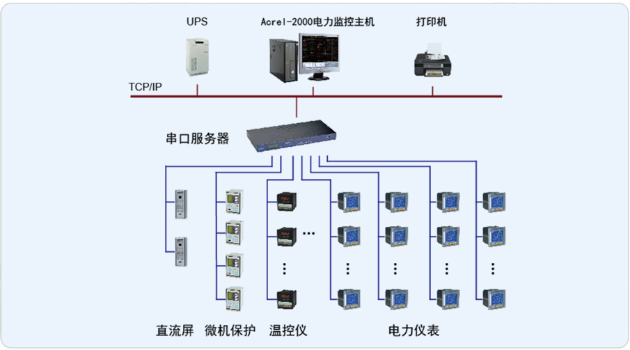 安科瑞對項(xiàng)目中10kV重要配電回路的多功能電表以及直流屏、溫控儀、光伏縱差保護(hù)裝置、小電流接地選線裝置等,采用現(xiàn)場總線組網(wǎng)方式,將采集數(shù)據(jù)傳至Acrel-2000電力監(jiān)控系統(tǒng),通過該系統(tǒng)實(shí)現(xiàn)變電所配電回路的配電監(jiān)測。