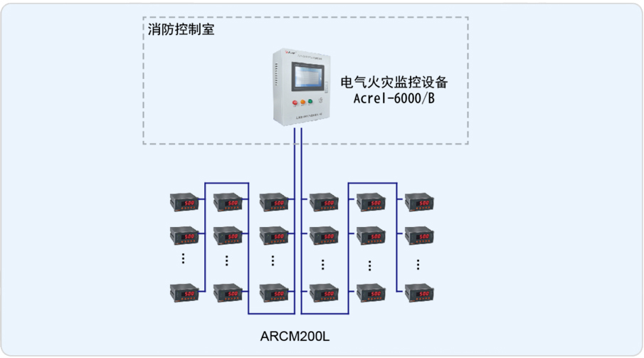 安科瑞于2014年9月承接了該項目電氣火災監控系統,整套系統由壁掛式電氣火災監控裝置安科瑞Acrel-6000/B、ARCM200L剩余電流式火災探測器組成。現場低壓配電柜內探測器采用2條485總線接至消控中心的Acrel-6000/B壁掛式電氣火災監控系統,當現場保護線路中的被探測參數超過報警設定值時,發出報警信號、控制信號,指示報警部位并保存報警信息。