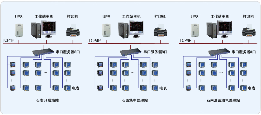 本系統(tǒng)針對以上需要解決的問題,對石南31聯(lián)絡(luò)站、石西集中處理站和石南油田油氣處理站三個站進行能耗管理系統(tǒng)改造,其中石南31聯(lián)絡(luò)站配置儀表78塊,石西集中處理站配置儀表35塊,石南油田油氣處理站配置儀表59塊,進線回路采用ACR320ELH多功能顯示儀表,出線回路采用PZ72-E4/KC,每個站為單獨一套系統(tǒng)。系統(tǒng)采用分層分布式結(jié)構(gòu),監(jiān)測數(shù)據(jù)采集完成后上傳傳至各自站內(nèi)監(jiān)控值班監(jiān)控室。