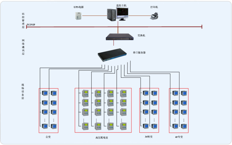 該項(xiàng)目由一個(gè)10KV高壓變電所,一個(gè)公變,以及兩個(gè)專變組成。該項(xiàng)目通過接入的21臺(tái)微機(jī)保護(hù)、50臺(tái)PZ96L-E4和兩臺(tái)溫控儀,監(jiān)測(cè)配電安全,保證變壓器在安全范圍內(nèi)運(yùn)行。通過專變和公變的同時(shí)監(jiān)測(cè),監(jiān)測(cè)整個(gè)工廠的耗能情況,確定高耗能范圍,實(shí)施節(jié)能措施,筑建綠色工廠。