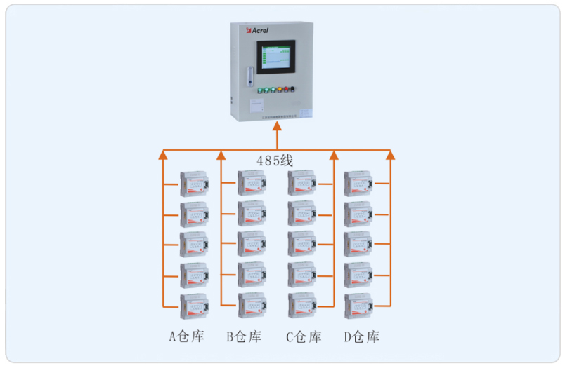 系統(tǒng)采用安科瑞消防電源監(jiān)控系統(tǒng),該系統(tǒng)主要采用分層分布式網(wǎng)絡(luò)結(jié)構(gòu),系統(tǒng)結(jié)構(gòu)為:站控管理層、網(wǎng)絡(luò)通訊層和現(xiàn)場(chǎng)設(shè)備層。其中廣陳第三方電子商務(wù)平臺(tái)托管產(chǎn)業(yè)基地現(xiàn)場(chǎng)設(shè)備分布為A、B、C、D倉(cāng)庫(kù)以及綜合辦公用房消防配電回路。該系統(tǒng)監(jiān)控所有消防配電柜內(nèi)消防回路雙電源的實(shí)時(shí)運(yùn)行狀態(tài),如有異常會(huì)后臺(tái)報(bào)警。所有監(jiān)測(cè)模塊通過485總線鋪設(shè)至消防控制室,消防電源監(jiān)控主機(jī)從而完成對(duì)監(jiān)測(cè)模塊的采集并監(jiān)控。