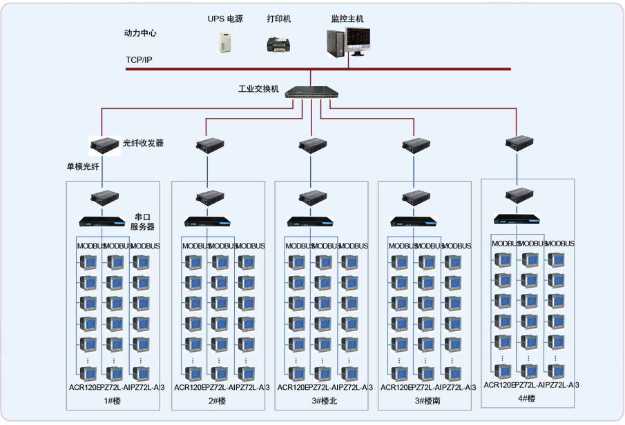 系統(tǒng)采用Acrel-2000型電力監(jiān)控系統(tǒng),整個系統(tǒng)采用網(wǎng)絡分布式結構,監(jiān)控主機位于2#樓前面地下一層的動力中心中,其他5個配電室分別位于1#、2#、3#、4#地下一層(其中3#有南北兩個配電室),所有配電回路均配備安科瑞電力儀表PZ系列及ACR系列。該項目實現(xiàn)了淄博運動員公寓4個樓內電力系統(tǒng)的智能管理。所有監(jiān)控設備均通過屏蔽雙絞線至各自配電室內的通訊管理機,再通過光電轉換器經(jīng)過光纖將數(shù)據(jù)傳輸至2#樓地下一層的動力中心,從而實現(xiàn)遠程監(jiān)控。