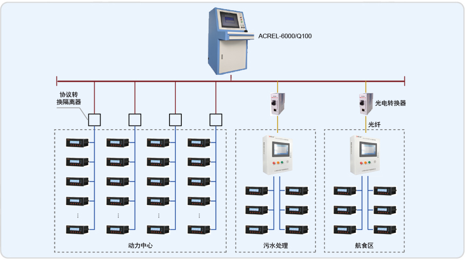 系統(tǒng)采用分層分布式結構,站控管理層及現(xiàn)場設備層,站控管理層設備為我公司一套琴臺式電氣火災監(jiān)控設備及2套壁掛式電氣火災監(jiān)控設備,對分散在各區(qū)域內的ARCM剩余電流式電氣火災監(jiān)控裝置進行遙測、遙信,實現(xiàn)監(jiān)控與管理。各區(qū)域內探測器采用RS485總線直接接入琴臺式電氣火災監(jiān)控設備。系統(tǒng)采用Acrel-6000電氣火災監(jiān)控系統(tǒng),實現(xiàn)對被保護電氣線路的實時監(jiān)測。