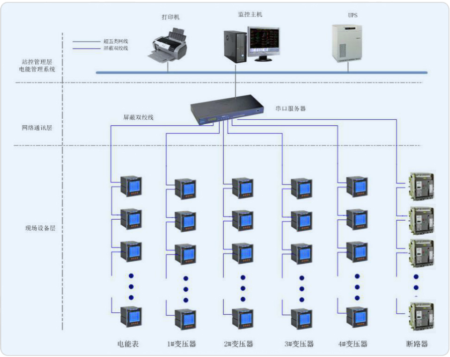 系統應通過多功能的電力監控裝置、通訊網絡和計算機軟件,實現醫院內供配電系統在運行過程中的數據采集、運行監視、事故預警、事故記錄和分析、電能質量檢測、三相不平衡監視、繼電保護等,完成醫院的安全供電、用電管理、設備管理和運行管理。系統由主控層、通訊管理層和現場控制層構成。系統要求盡量減少集中采集數據的裝置以保證系統的通訊可靠性。