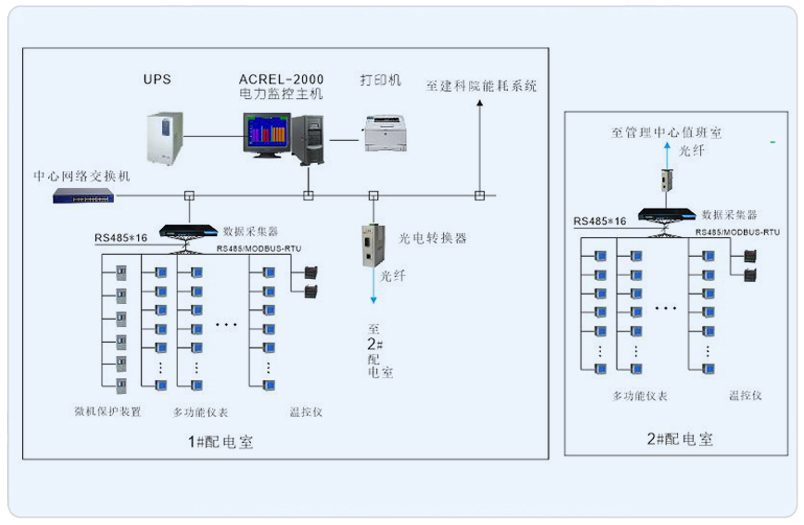 系統(tǒng)采用Acrel-2000型電力監(jiān)控系統(tǒng),監(jiān)控主機(jī)位于1#配電室內(nèi)電力監(jiān)控值班室,2#配電房距離值班室較遠(yuǎn),通過通訊管理機(jī)將采集的數(shù)據(jù)經(jīng)處理后經(jīng)光纖收發(fā)器和光纜上傳至位于1#配電室內(nèi)電力監(jiān)控值班室;所有配電回路均配備安科瑞電力儀表ACR系。該項(xiàng)目實(shí)現(xiàn)了13號(hào)地塊電力系統(tǒng)的智能管理。所有監(jiān)控設(shè)備均通過屏蔽雙絞線至各自配電室內(nèi)的通訊管理機(jī),再通過光電轉(zhuǎn)換器經(jīng)過光纖將數(shù)據(jù)傳輸至1#配電室內(nèi)電力監(jiān)控值班室,從而實(shí)現(xiàn)遠(yuǎn)程監(jiān)控。