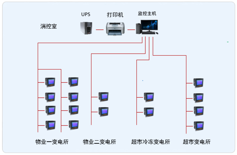 系統(tǒng)采用Acrel-2000型電力監(jiān)控系統(tǒng),整個系統(tǒng)采用網(wǎng)絡(luò)分布式結(jié)構(gòu),監(jiān)控主機(jī)位于消防監(jiān)控室中,其他4個配電室分別位于地下一層。該項目實現(xiàn)了湖州萬達(dá)4個10kV變電所的智能管理。所有監(jiān)控設(shè)備均通過屏蔽雙絞線至后臺監(jiān)控主機(jī),從而實現(xiàn)遠(yuǎn)程監(jiān)控。